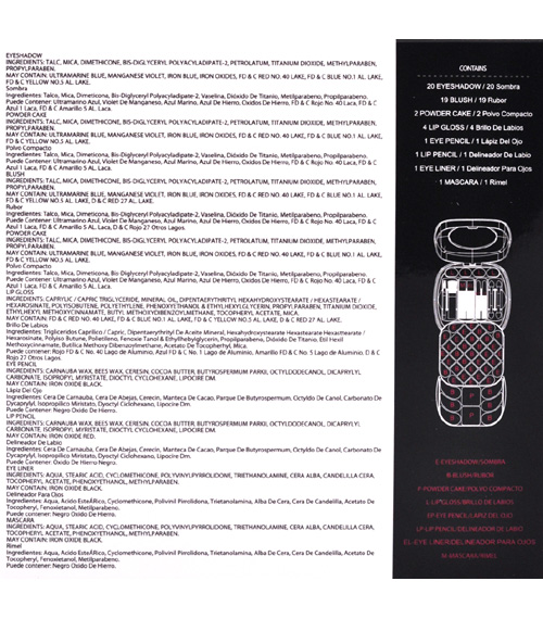 20 EYESHADOW, 19 BLUSH, 2 POWDER CAKE, 4 LIP GLOSS, 1 EYE PENCIL, 1 LIP PENCIL, 1 EYE LINER, 1 MASCARA